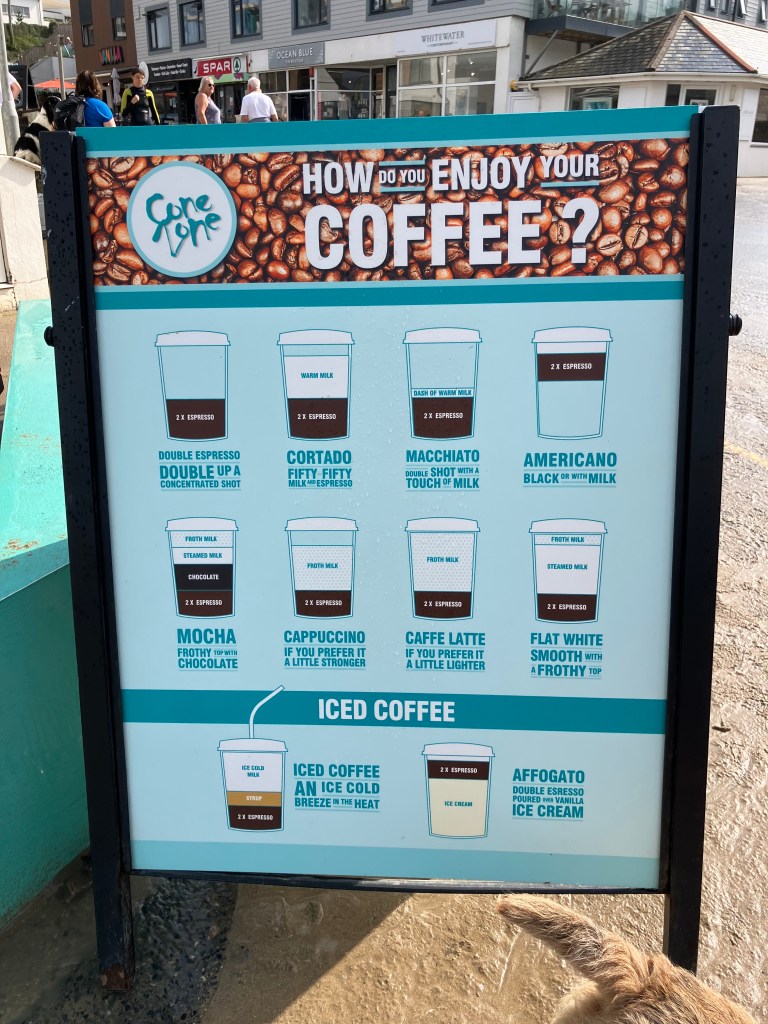 Ble plutselig overrasket av en kraftig regnbye da vi var ute og søkte dekning under en parasoll med en kopp kaffe mens vi ventet på at det skulle gå over. Det er jo så forvirrende med alle disse kaffene så vi var heldig da vi kunne få en fullstendig oversikt: