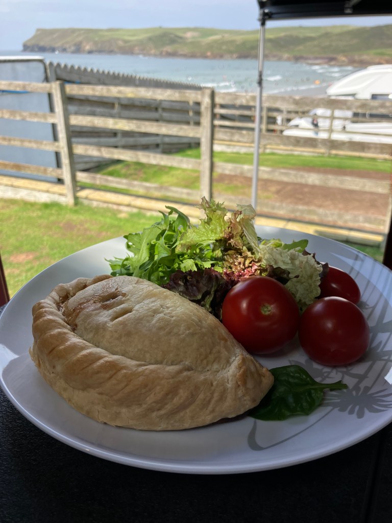 Søndag i dag og under over alle under – discobaren på stranden holdt lukket. Så vi kunne nyte lyden av atlanterhavsbølgene mot stranden i hele dag. I går da vi var borti «byen» for å skaffe oss den lokale nasjonalretten pasty til middag var de utsolgt på Spar butikken så vi gjorde et nytt forsøk i dag og fikk fatt i 2 stykker på en av de lokale kaféene som vi tok med hjem. Pasty er en innbakt butterdeig fyllt med oksekjøtt, poteter og kålrabi. Veldig godt hvis den er laget skikkelig og det var denne. Nam nam.