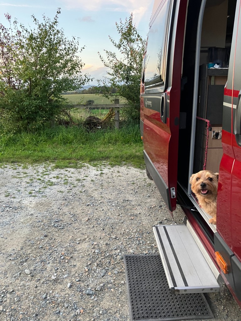 Kjekt her på pub-parkeringen synes Maggie. Hun er nå glad når vi kommer frem uansett hvor vi er.