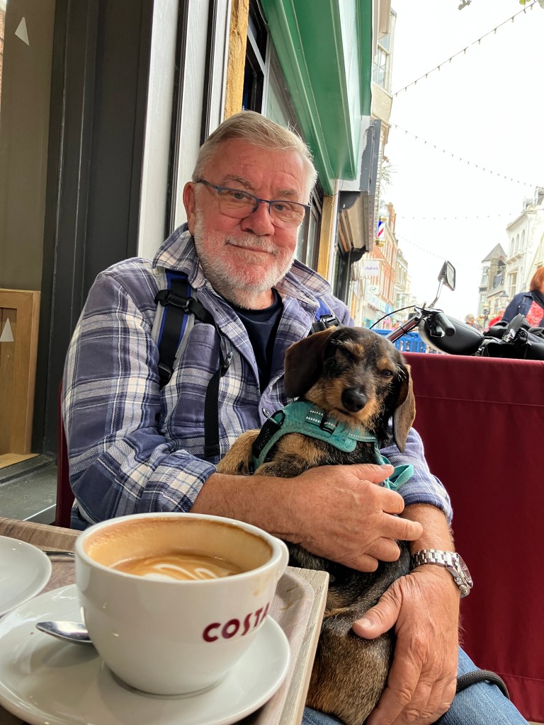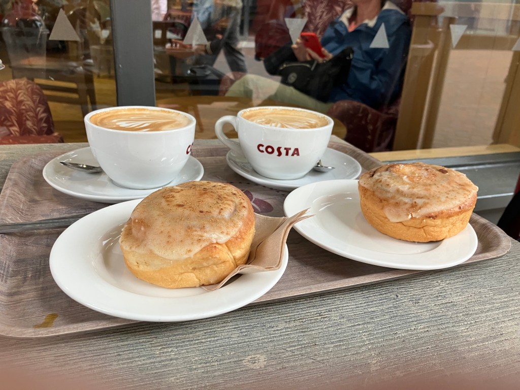 Ble jo trøtt i beina og kaffetørst av slik byvandring så da var det godt å komme på en Costa kafé og få flat white og kanelbolle. Som vi klarte å spise uten at noen agressive måser (vi så ingen) snappet dem fra oss. Da hadde vel Albert gått til angrep tenker vi, liker å jage fugler.