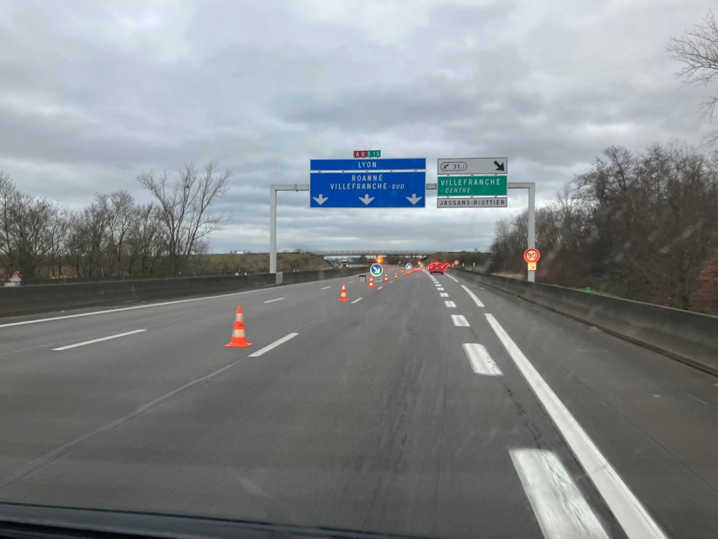 Da vi kom til Mulhouse og skulle ta av motorveien inn til Frankrike var den nemlig STENGT ! Vi hadde brukt Google Maps og der var ingen advarsel om det. Vi måtte kjøre videre til neste avkjørsel å snu og kjøre nordover igjen. Da stoppet vi på en rasteplass og omdirigerte til Apple Maps og damen der fant en B vei som « smuglet» oss over grensen og inn på en ny motorvei. Den går til Lyon ene veien og Paris den andre.