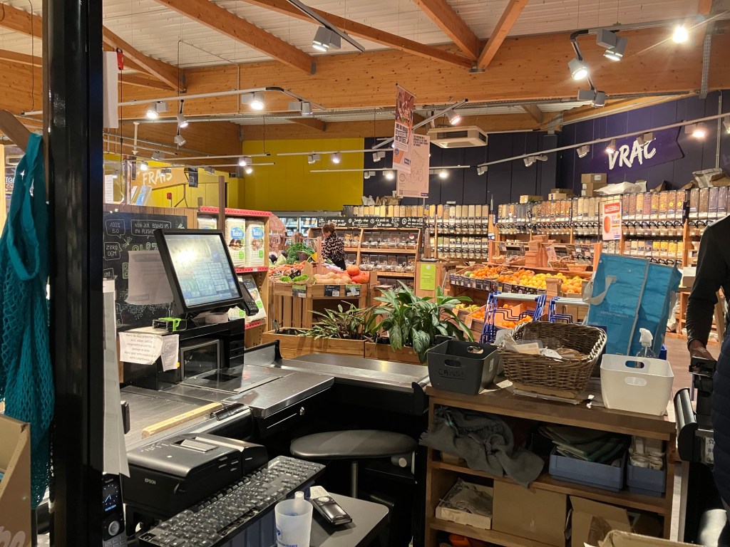 Her var alle tørrvarer i store glassbeholdere og så hadde du din egen pose med som du fyllte opp. All frukten var i papirposer og alt var økologisk. Helt greit. Vi fikk nå et par bananer og 2 frosne øko pizzaer. Men nybakt baguette kunne vi bare drømme om.