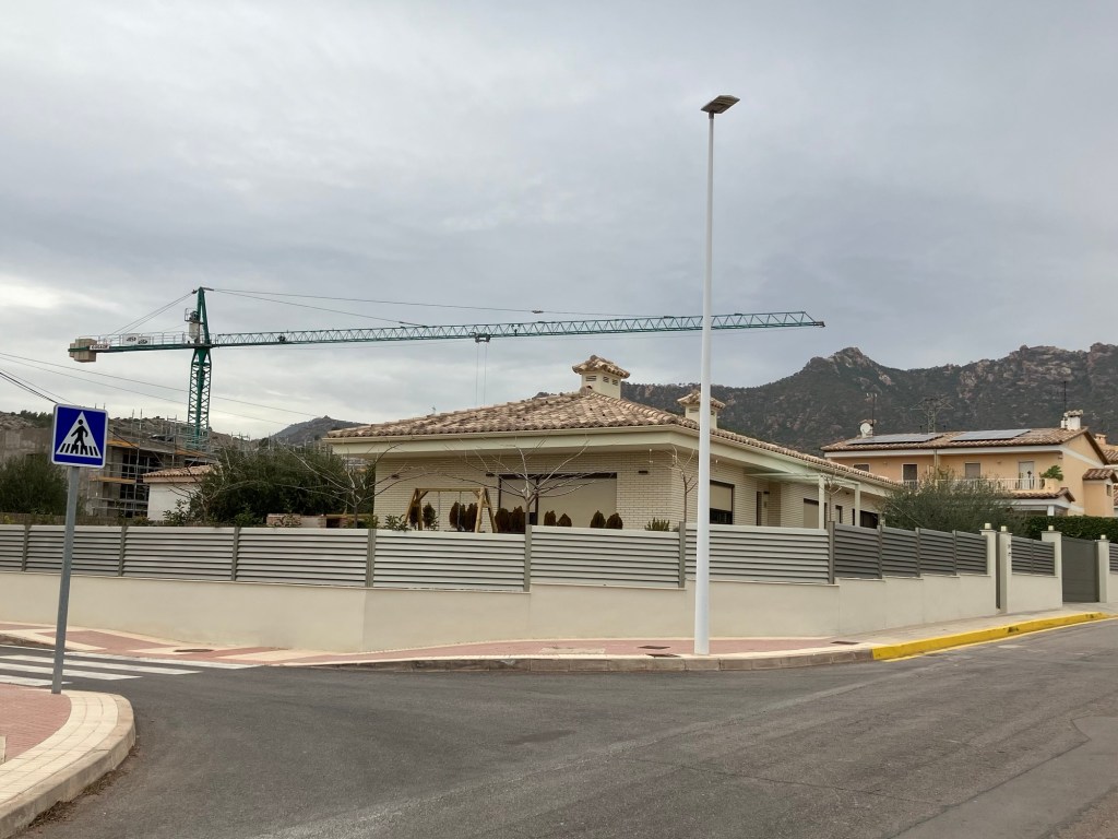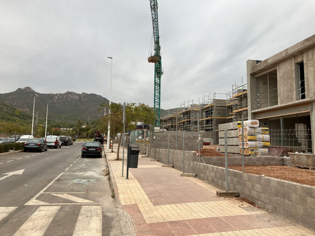 For noen år siden bygget de denne veien som ender i en rundkjøring slik at du snur og kjører ned gaten på andre siden. Her er det oppmerket for parkering på begge sider av gaten, inkl. handikap parkering. Spanjolene innser at folk har bil og legger tilrette for det. Så kom bosskorgene opp. Spanjolene innser at folk har hund og vil ha et sted å putte hundeposene. Så ble det plantet trær slik at det gir skygge og brede fortau og fotgjenger overgang. Dette var lenge før de begynte å bygge. Hjemme kommer jo husene først og fortau og annen luksus lenge etterpå.