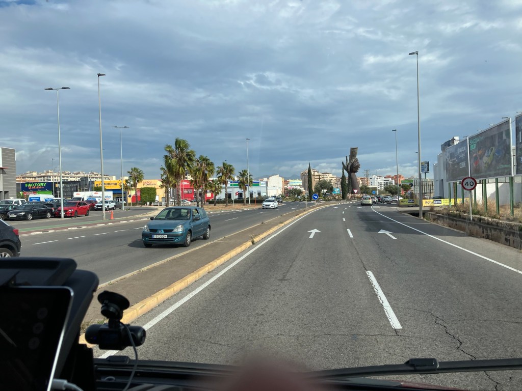 Forbi alle appelsintrærne og så følge epledamen rundt på alle bensinstasjoner underveis. Først var vi på to Cepsa stasjoner men der var det blankt nei. Så kom vi til en Repsol og der hadde de gass på tanken så vi tenkte vi kunne jo fylle opp vår innebygde tank. Men her i Spania må du ha en spesiell adapter – og det hadde ikke vi – hadde alle de 3 andre som brukes i Europa men lite hjalp jo det. Vi kjørte så til 2 Repsol stasjoner med samme resultat, inkludert en midt i sentrum av Castellon og da ble Mona litt på tuppa. Var glad det ikke var hun som kjørte.