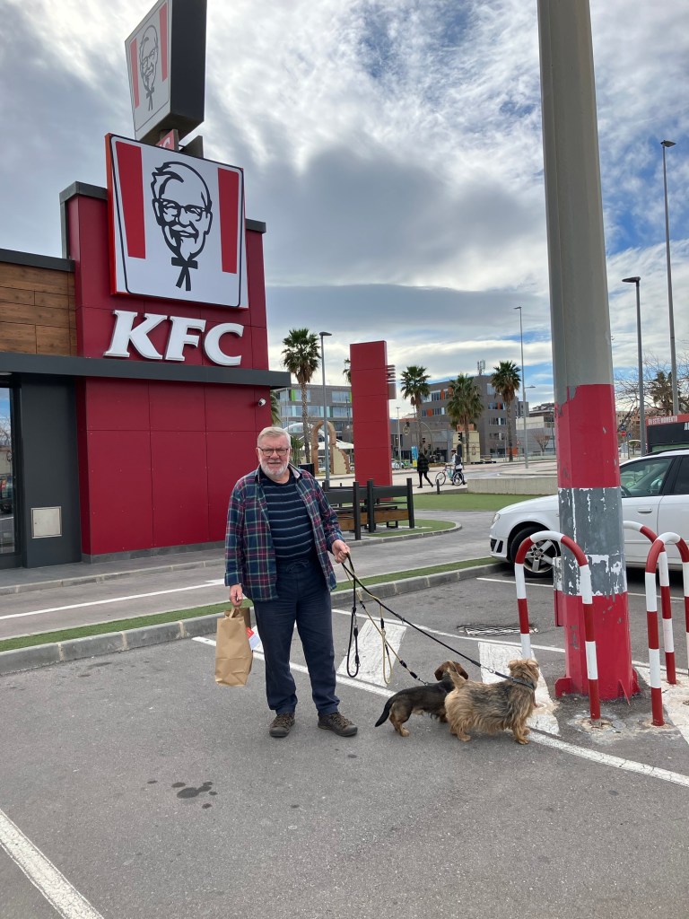 Mens vi måtte ha mat og ble fristet over evne over en KFC på parkeringsplassen. Må være 30 år siden vi kjøpte noe der, men er du desperat så er du desperat. Og så delte vi med hundene så da ble nå de fornøyd i alle fall. Så får vi andre heller gulpe frityrolje resten av dagen.