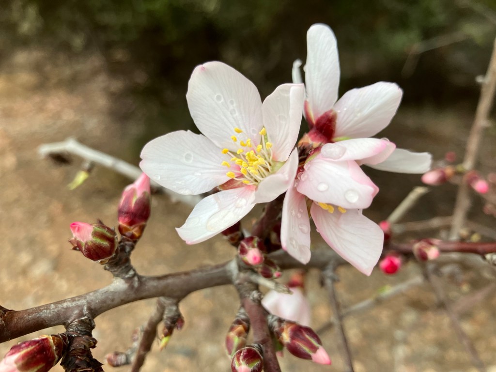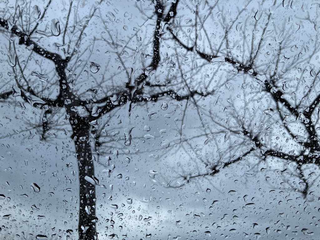 Det er regn på mandelblomstene som akkurat har begynt å blomstre og det er regn på takvinduet og Albert hygger seg med å holde gaten under oppsikt fra vinduet. Ikke akkurat mye som foregår der på en regnværsdag. Men blir likevel helt utslitt.