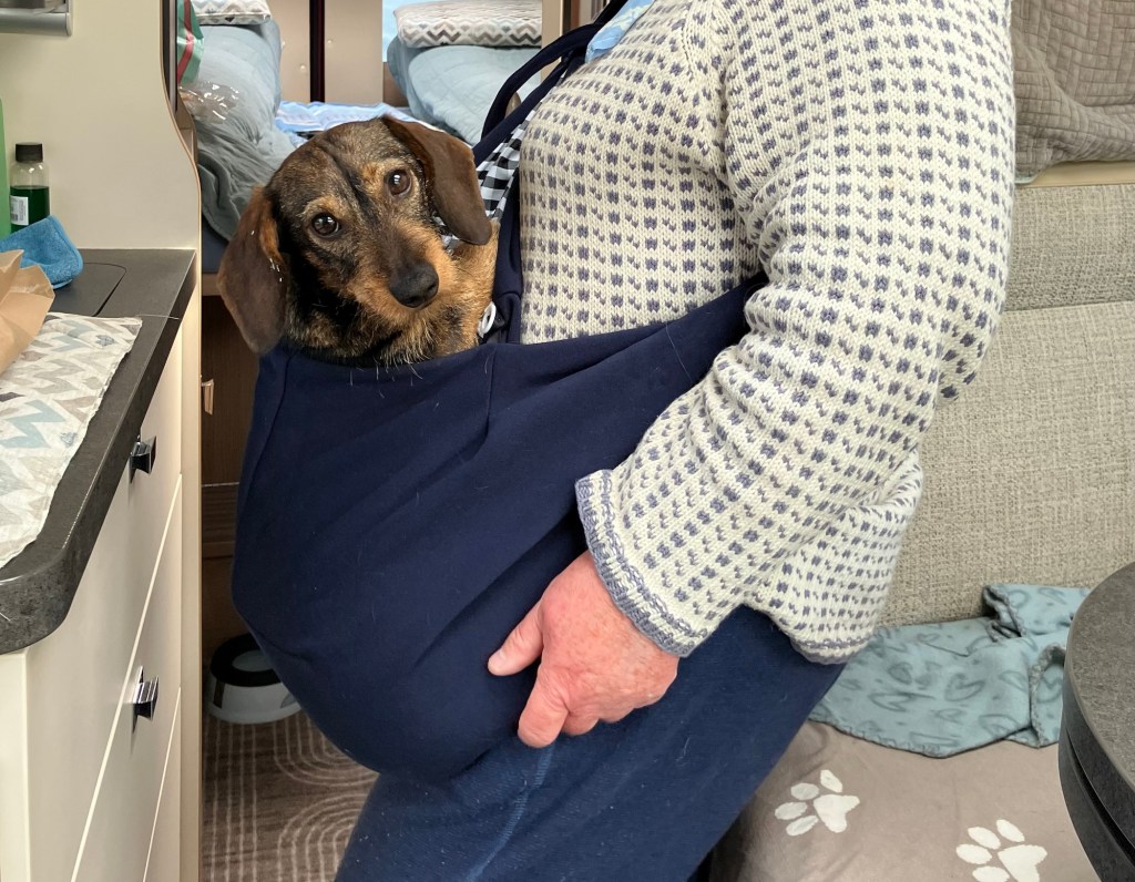 En av fordelene med å ligge lenge på ett sted er at du kan bestille ting på nettet og få det tilsendt. Vidunderlige nye verden ikke sant. Rett fra Amazon i England har vi nå fått bæresele til vår meget forbrelte dachsund. Nå kan han sitte i den på kafé og Mona kan ha begge hendene fri. Vil bli utprøvet en av de første dagene.