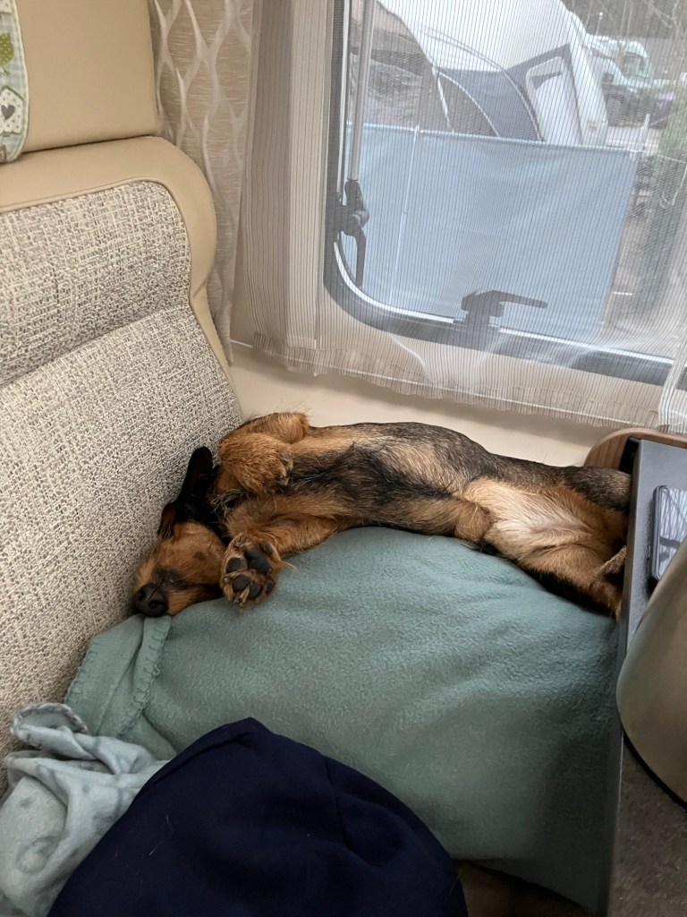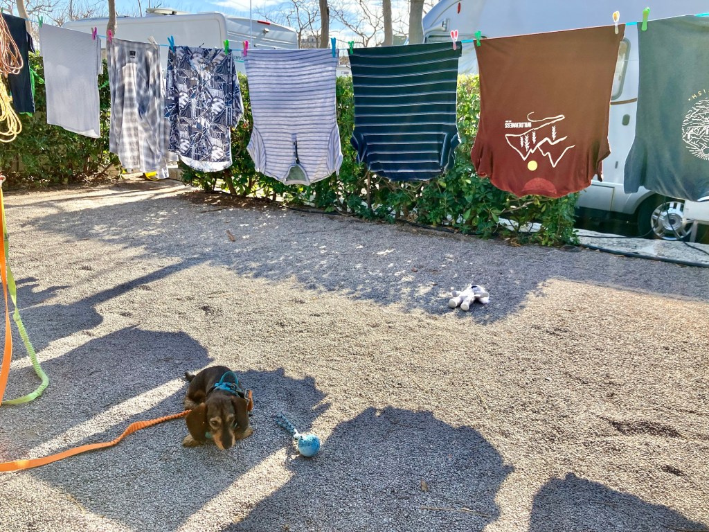 Det var meldt 18 grader i dag men vi tror det må være mye mer. Vi må sitte i skyggen og Albert fant skygge under klesvasken – som var tørr på null komma niks.