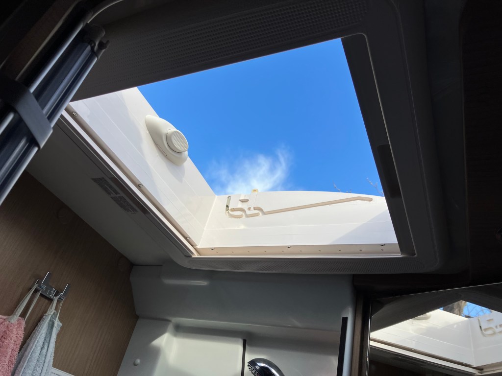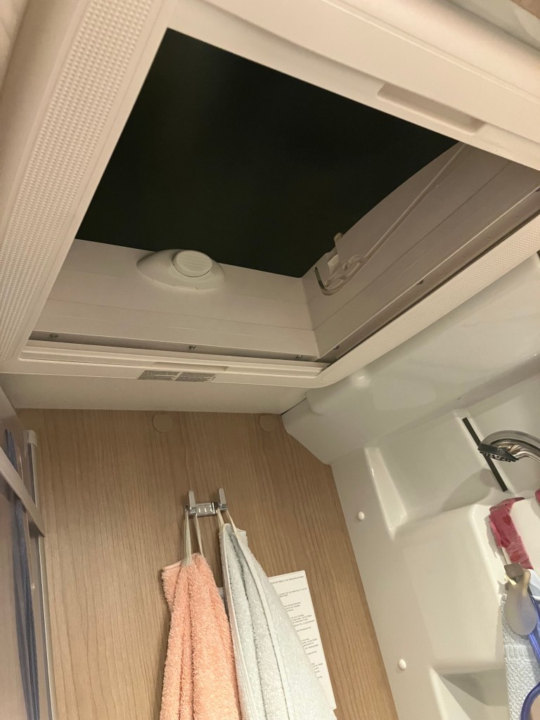 Da vi skulle legge oss var det noen utrolig sterke vindkast og plutselig var det et bråk fra taket og da Mona løper ut for å se hva det var ser hun takluken fra badet blåse bortover gaten. Hun piler etter og får reddet den men den var knust flere steder og det ene hjørnet var borte.