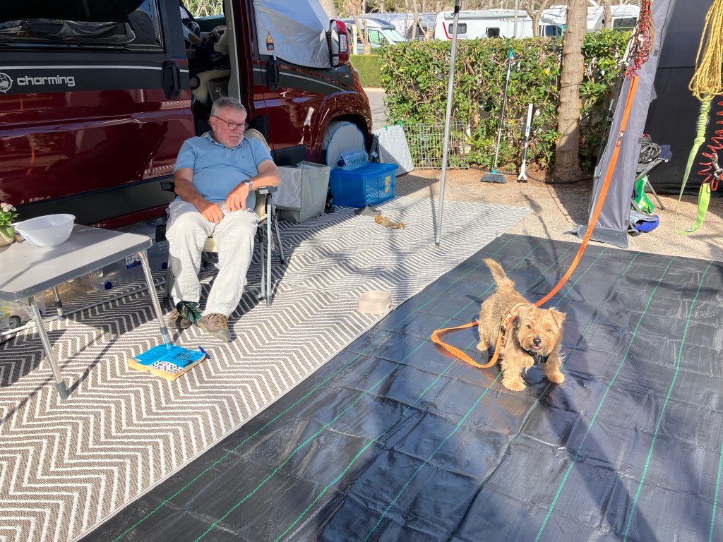 Ettersom det er så støvet på terrassen og hundene er nybadet har vi gått til innkjøp av et svart plastdekke som er siste skrik her på campingen. Hva skulle vi vel gjort uten Lidl og sine tilbud på hundrevis av ting du plutselig finner ut du trenger ?