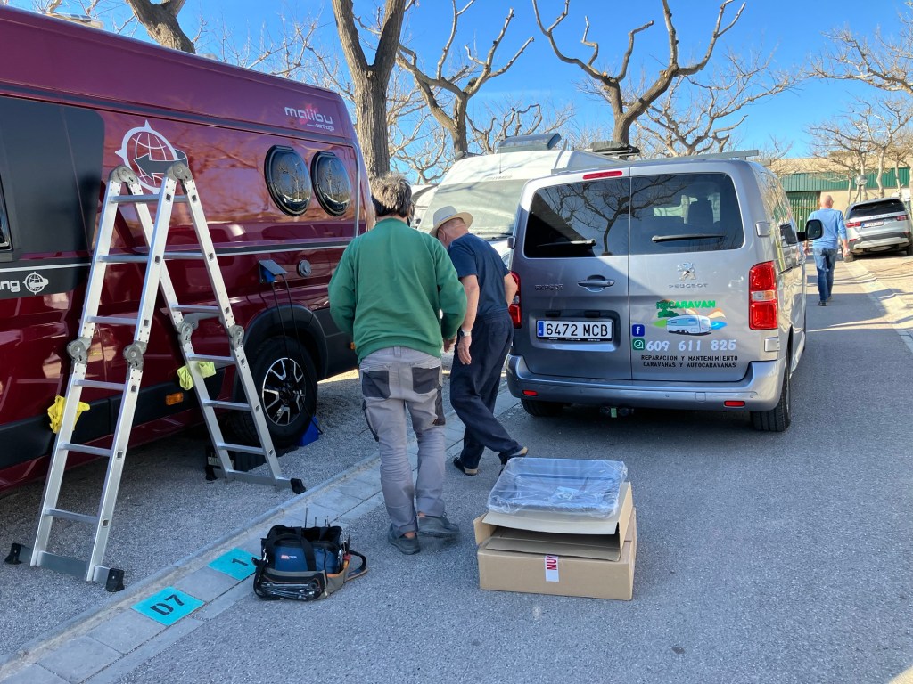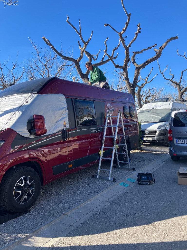 Og mens han likevel var oppe på taket fikk vi han til å vaske solcellepanelet, mye sahara-sand som fyker omkring og legger seg på taket og alle andre steder.