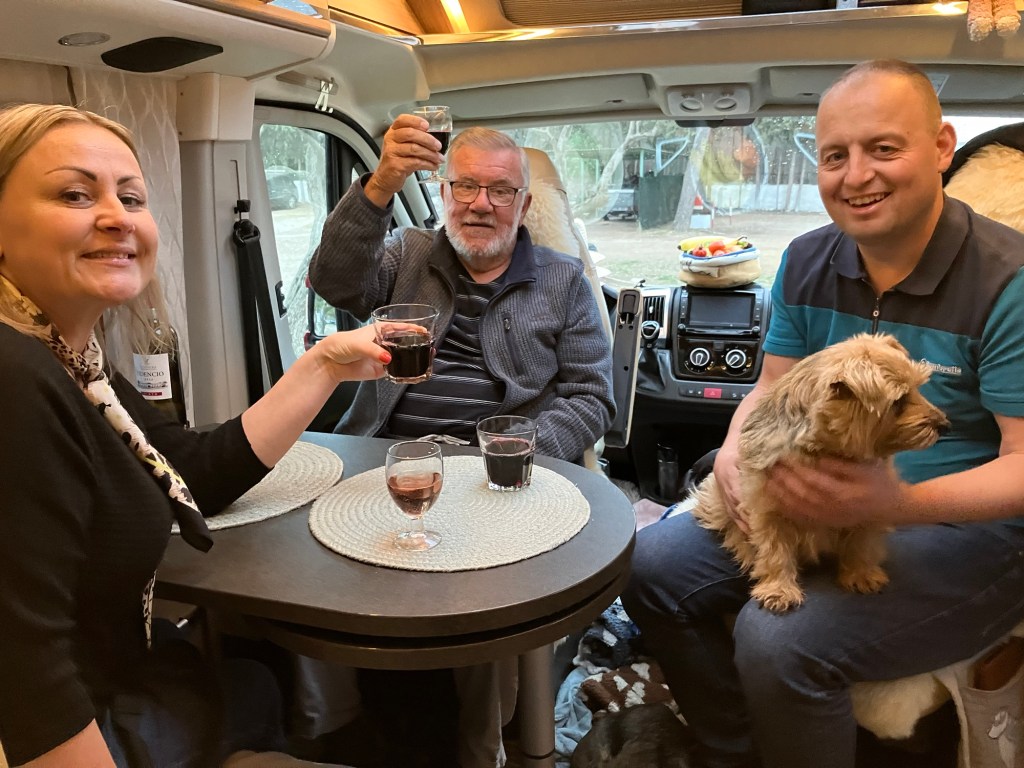 Dagen etterpå da vi skulle reise våknet vi til blå himmel og strålende sol – typisk. Men det var nå kjekt å se campingen i godvær også.