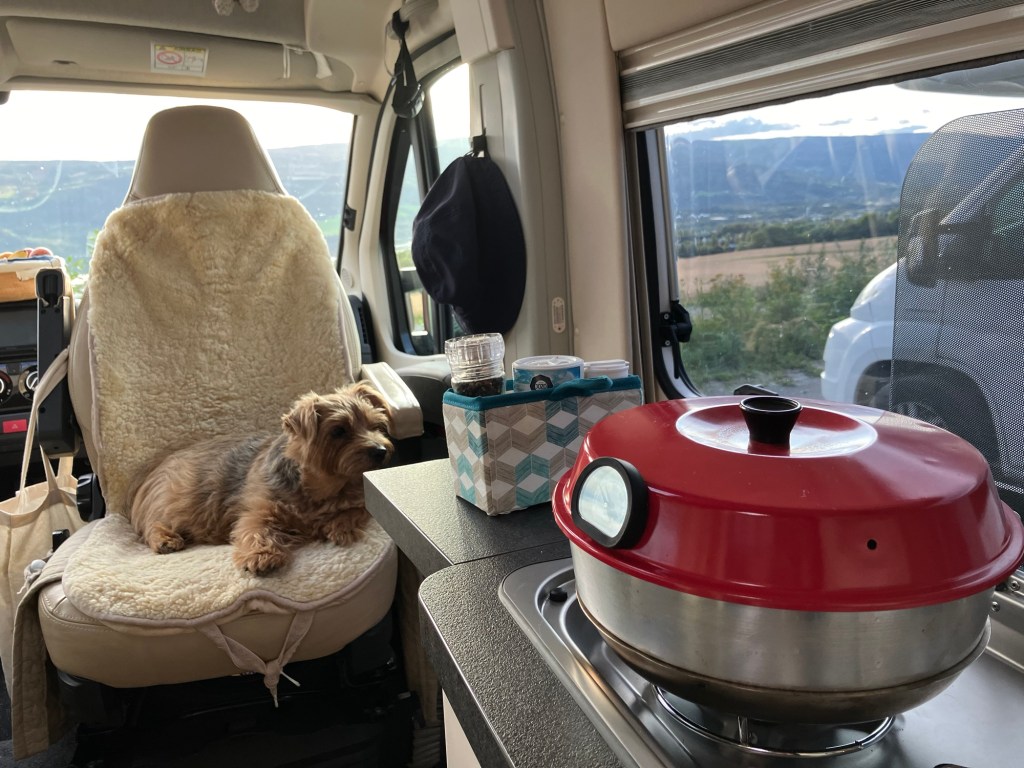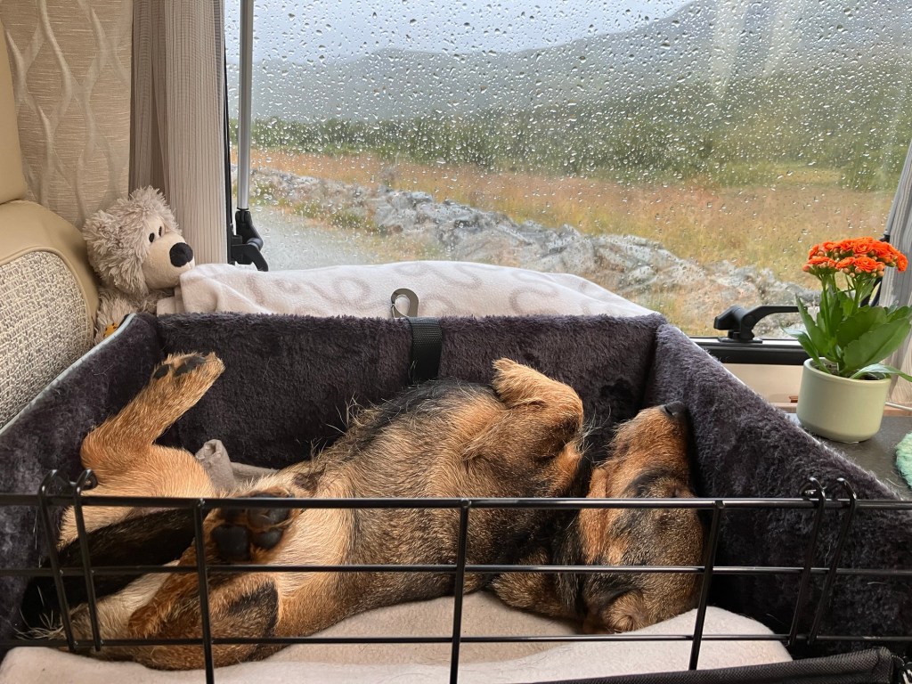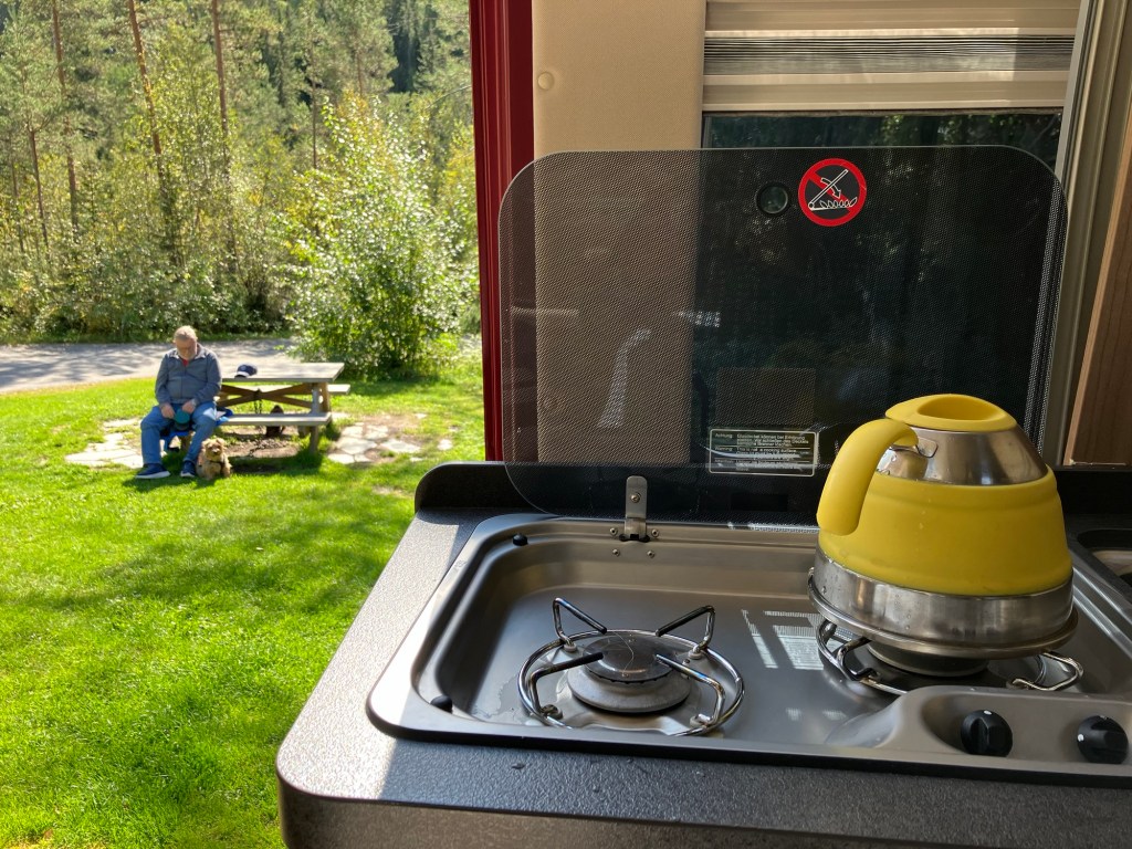Ikke så langt å kjøre i dag og da vi endatil våknet til REGN ( er vi ikke øst for vannskillet nå ???) tok vi oss god tid til frokost. Uansett er det mye som skal gjøres for bobilmennesker med 2 hunder på tur. De skal ha sin frokost og tur og da Mona kom tilbake med hundene og skulle ha sin frokost var de 3 andre bobilene som var her i natt allerede forsvunnet. Vi var jevnt fordelt på nasjonaliteter – 2 norske og to tyske.