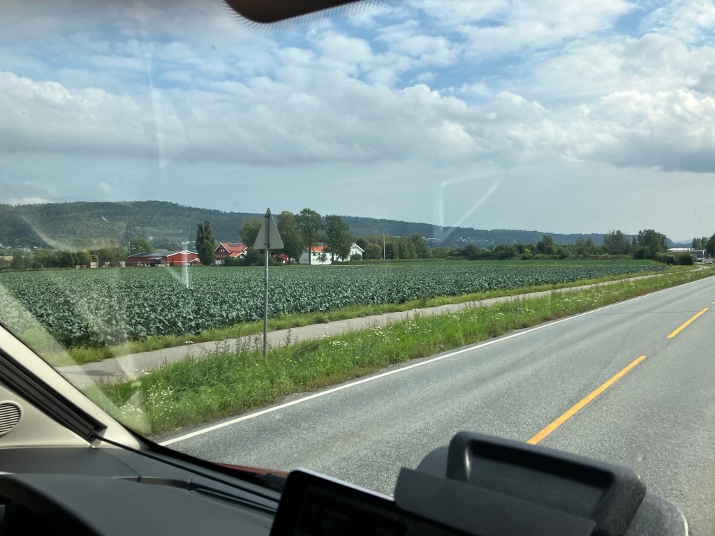 Kartleser/co-pilot satt for det meste og strikket i dag så det ble tatt lite bilder i dag. Ikke så mye interessant syntes vi, først en masse kornåkre og så ble det frukt og grønnsakåkre da vi kom til Lier.