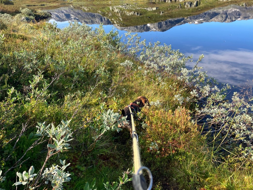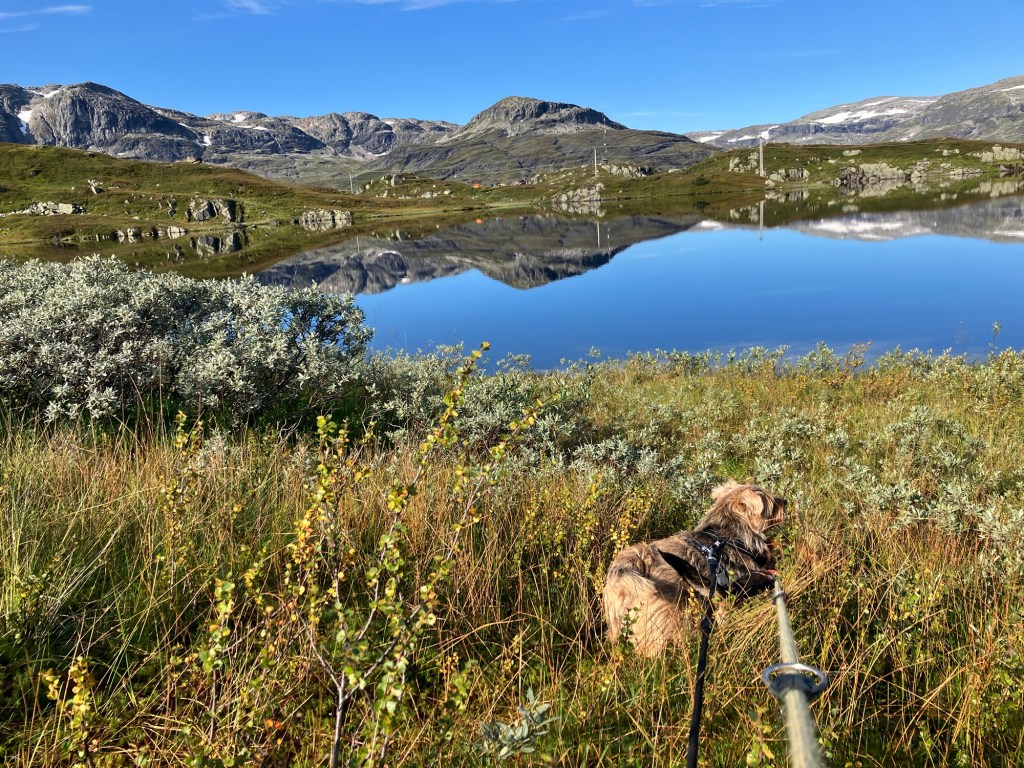 Strålende dag på Haukeli. Mona spiste frokost på trappen i dag, hadde ikke hjerte til å sitte inne. Det samme gjorde hundene som vi ankret bak i bilen, fine lastefester der som er enkel å feste bikkjene i.