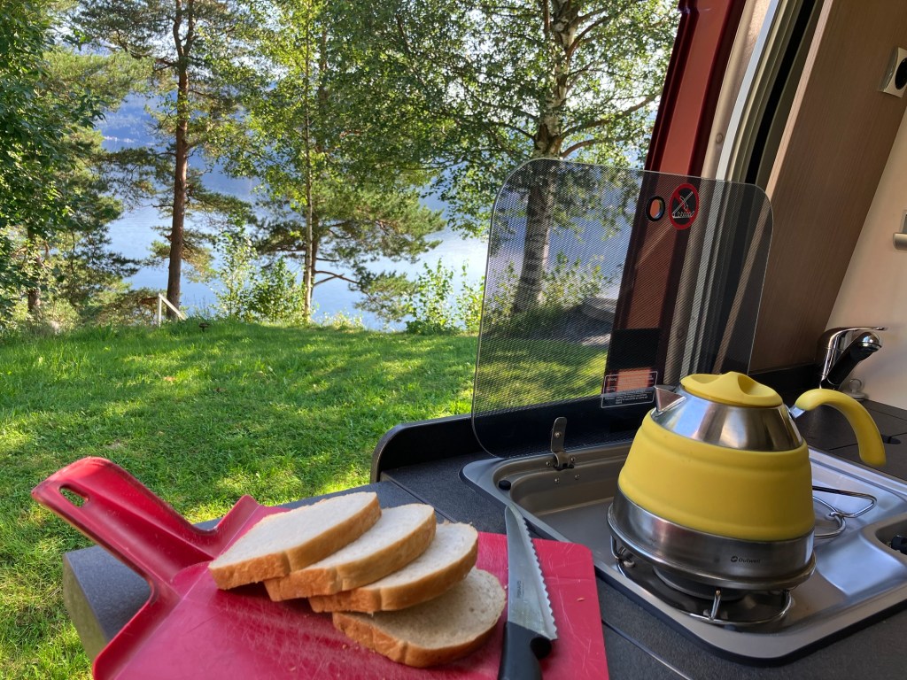 Kjekt med bobil. Her kan du koke kaffe og lage lunsj ombord.