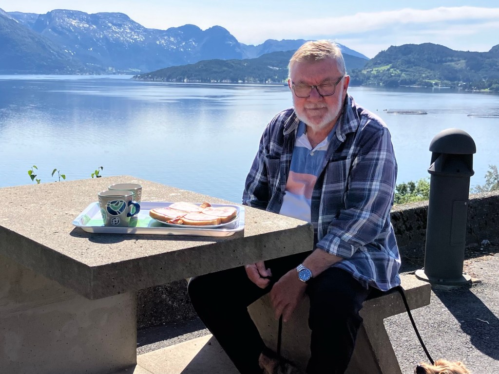 Og så kose deg med maten ute i solskinnet. Nå er det ikke lange veien hjem og vi sier takk for oss for denne gangen, en nydelig dag på Vestlandet som avslutning på vår lille ukestur til Østlandet.