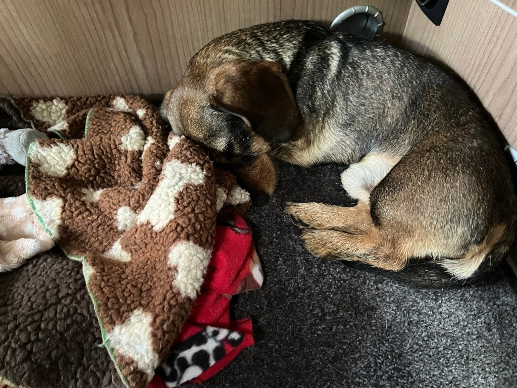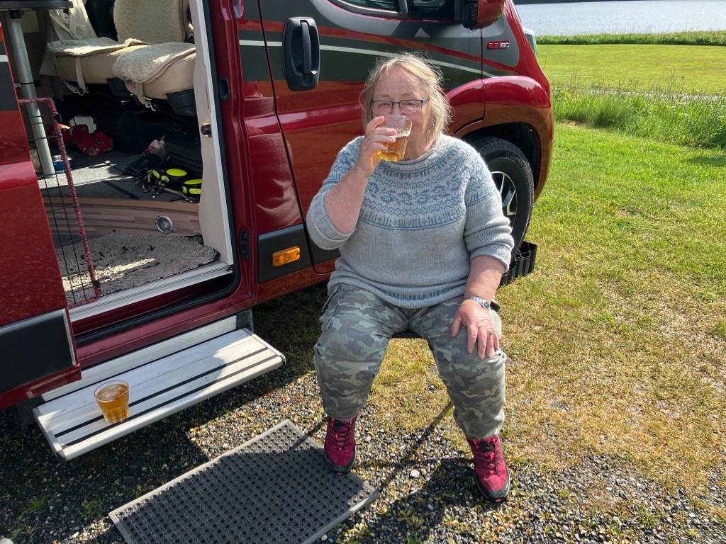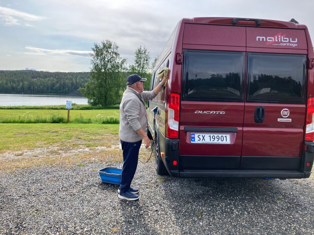 I dag har vi det vi kaller «liggedag» – vi ligger altså i ro. Men noe slaraffenliv ble det ikke om formiddagen i alle fall. Det er en del du må ta deg av når du har vært på tur noen dager. Doet og gråvannstanken må tømmes og vanntanken må fylles. Så er det støvsuging og støvtørking. I tillegg til det daglige reie opp senger, lage mat og vaske opp. Vi gjorde alt dette i formiddag og klarte akkurat å få inn en liten tur med Albert før det braket løs. Det høljet ned og vi fikk flere timer med torden. Dette hadde fru Yr ikke brydd seg med å informere oss om.