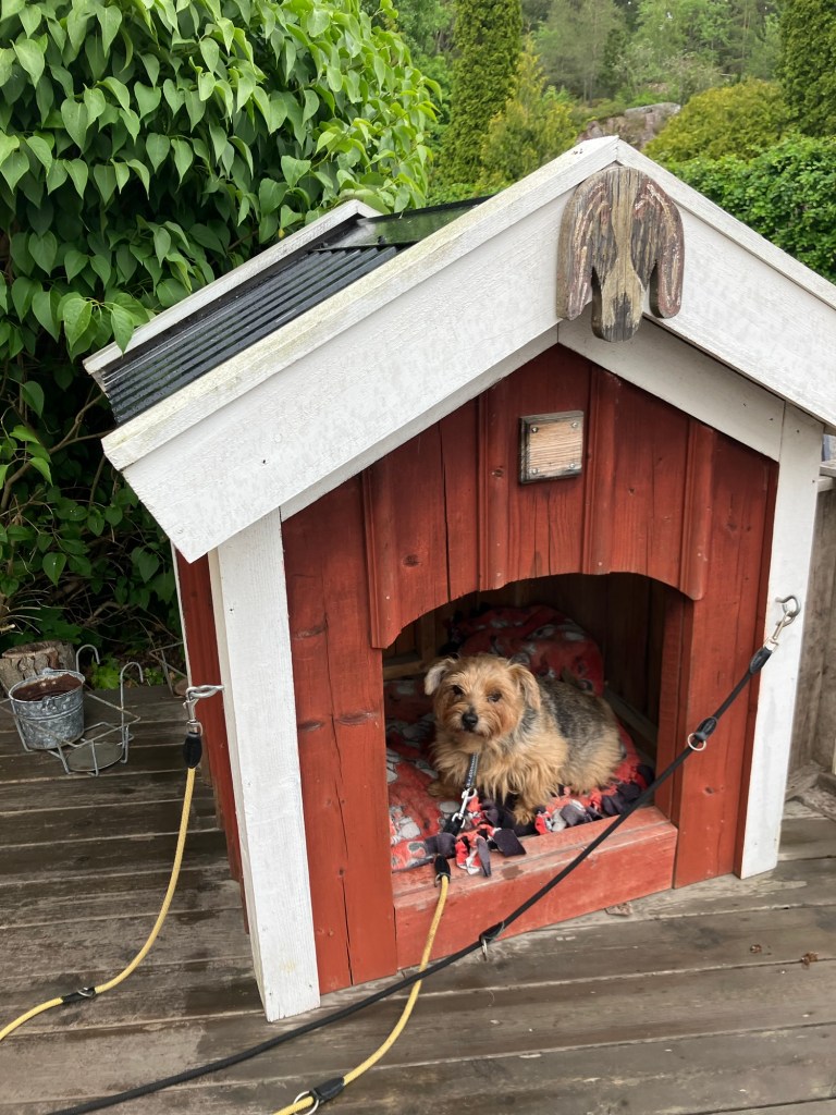 Igjen har vi hatt omrokkering på hundene. Nå er Albert i polstret seng på sofaen og Maggie i bur under bordet.