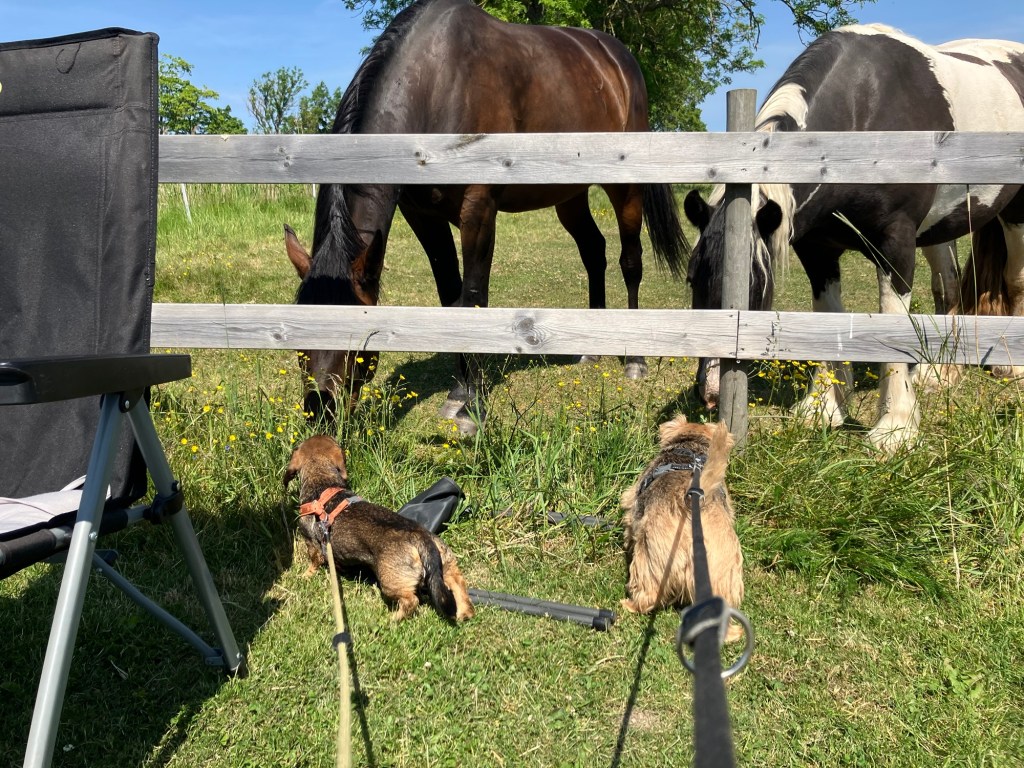 Her på Jonsboda er hestene nærmeste naboer. Det var fryktelig skummelt syntes Albert, men hestene har tydeligvis møtt dachser før for de reagerte ikke på boffingen i det hele tatt.